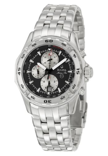From Bulovas Marine Star series comes this bold and sporty chronograph crafted from gleaming stainless steel The large round steel case showcases a black dial with luminous hands and markers a white seconds ruler and a date window at the six oclock hour Three round subdials display hours toBulova Men's 96G55 Marine Star Chronograph Watch Do not Miss!! From Bulovas Marine Star series comes this bold and sporty chronograph crafted from gleaming stainless steel The large round steel case showcases a black dial with luminous hands and markers a white seconds ruler and a date window at the six oclock hour Three round subdials display hours to... Bulova Men's 96G55 Marine Star Chronograph Watch